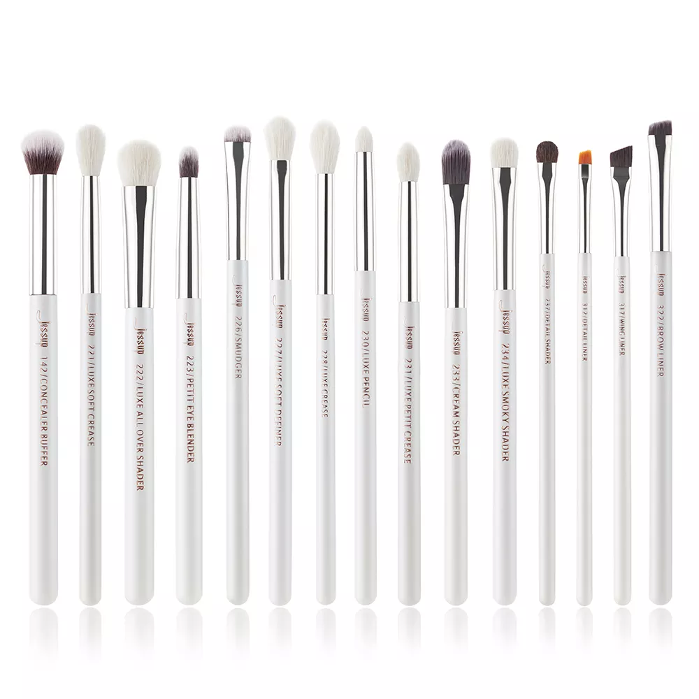 Each brush is handcrafted with a unique mix of natural and synthetic bristles, offering the best of both worlds—softness, control, and excellent powder pickup. With a weight-balanced birchwood handle and stunning golden ferrules, these brushes not only perform beautifully but also feel luxurious in hand. Use them to shape, define, shade, and highlight your eyes with professional precision—at home or on set.
