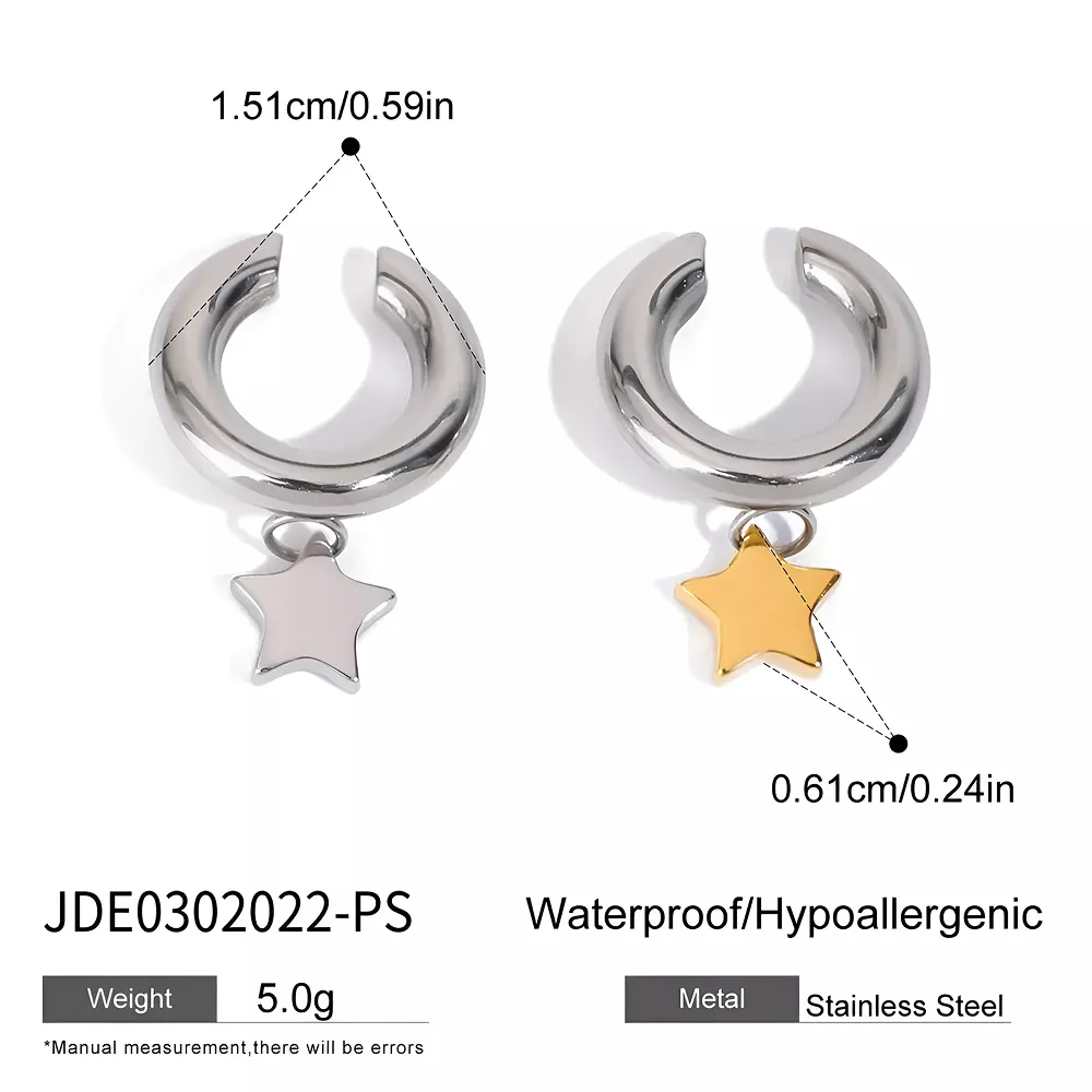 Crafted from high-quality stainless steel and finished with a rich 18K PVD gold plating, this ear clip shines with a luxurious luster that doesn’t fade over time. The star-shaped charm adds a playful yet chic detail that stands out on its own or pairs beautifully with other earrings. And because it’s a clip-on, it’s ideal for everyone—no piercing required.