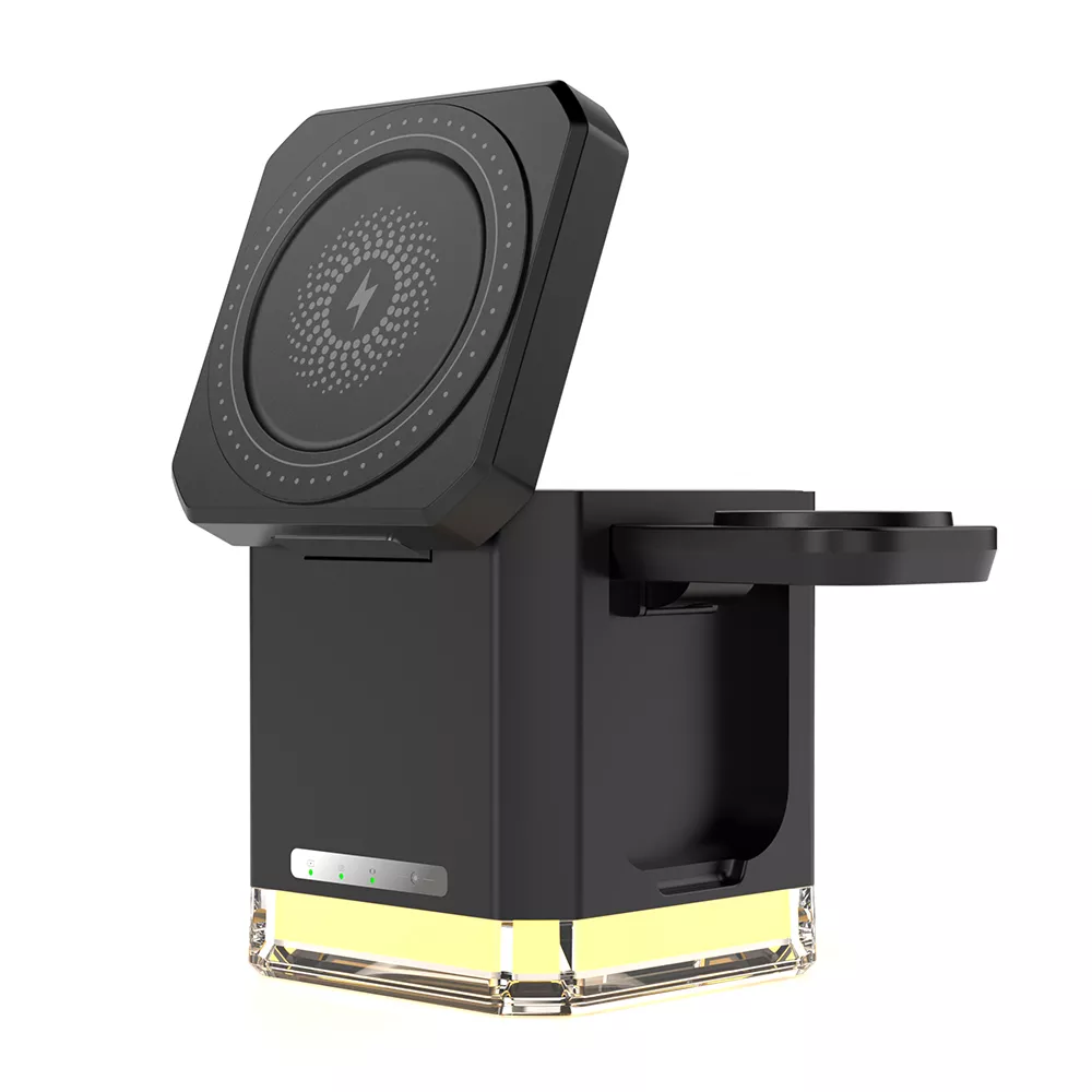 This foldable charging stand combines functionality with elegant design. It folds flat for portability and opens into a sturdy stand that displays your phone upright, making it easy to check messages, take calls, or stream videos while charging. An integrated LED light adds a modern touch and gives a gentle glow to your nightstand or workspace.