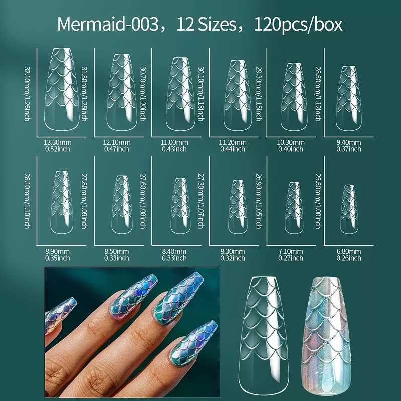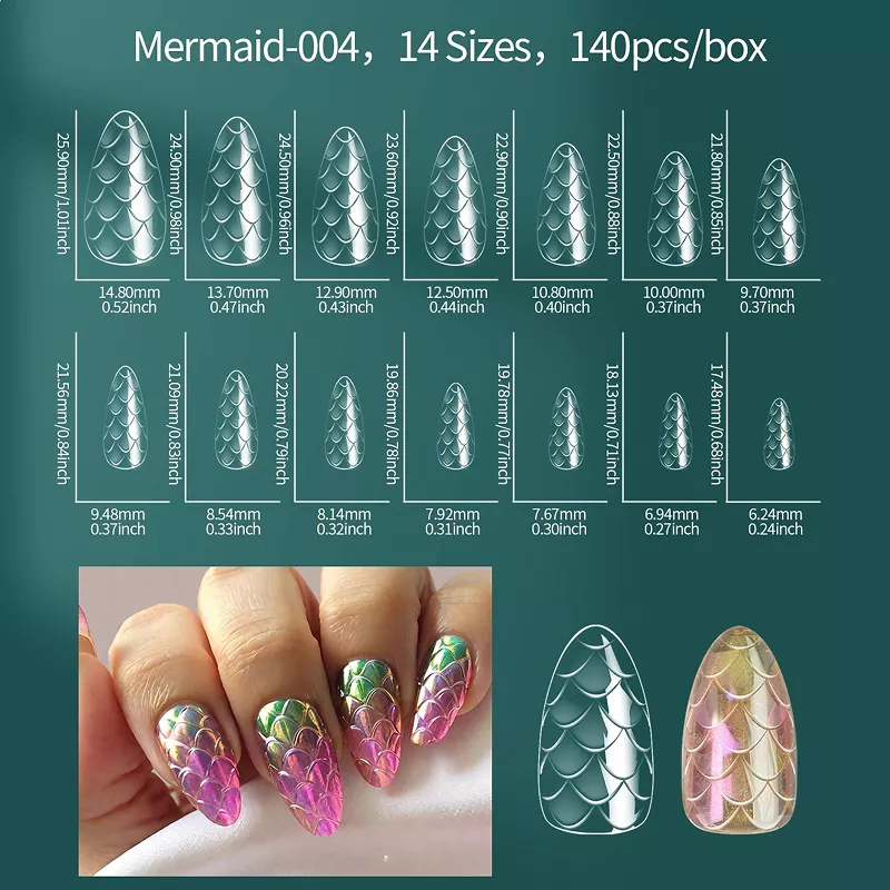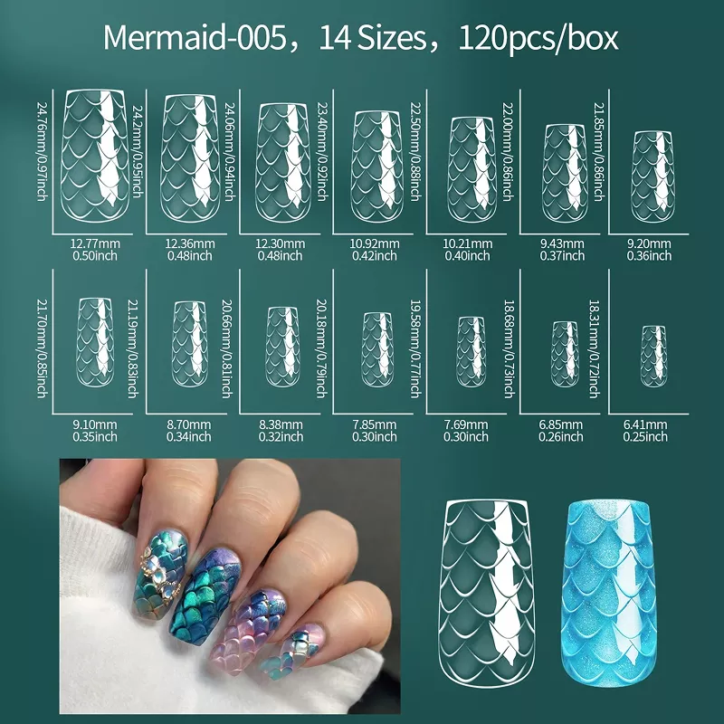 Our 3D Mermaid False Nail Tips are designed for both beauty and practicality. The soft gel material fits comfortably, naturally curving to your nail for a seamless look. With a variety of shapes to choose from, including almond, coffin, square, and oval, you can easily find the perfect style to suit your taste. The durable construction of these nails ensures they will withstand daily wear while the natural fit prevents any discomfort. Plus, the 12 or 14 sizes included in each set make it easy to find the right fit for every finger, ensuring your manicure looks perfectly tailored to you.