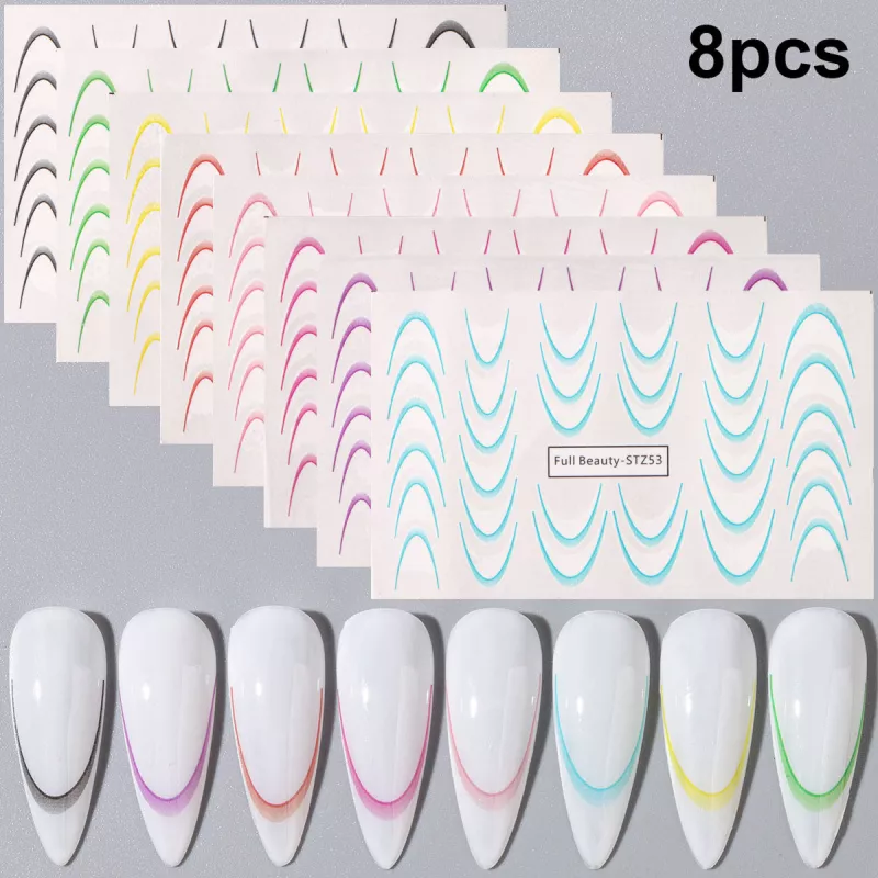 Whether you’re a seasoned nail artist or just looking for an easy way to elevate your DIY manicures, the 8pcs Gradient French Nail Stickers Set is perfect for you. The vibrant colors and versatile designs can be used to create a variety of looks, from subtle gradients to bold, colorful statements. These stickers are ideal for home use, salon professionals, or as a fun gift for friends and loved ones who love to express themselves through their nails.