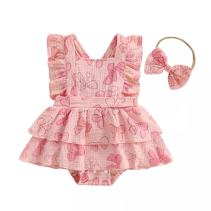 This romper is not just stylish—it’s designed with your baby’s comfort and your convenience in mind. Whether you’re heading to a summer picnic, a birthday party, or just enjoying some sunshine at home, this outfit is an effortless go-to. Its bow pattern and layered design give it a boutique feel, while the soft fabric and sleeveless cut keep your baby happy and cool. The included headband ties the whole look together for picture-perfect moments.