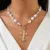 Crafted from high-quality simulated pearls and durable zinc alloy, this necklace offers a luxurious feel without the weight. The pearls are baroque-shaped, giving each bead an irregular and organic look that makes the necklace truly one of a kind. The cross pendant hangs gracefully from a sturdy link chain, adding a symbolic and edgy element to the design. Available in both gold and silver tones, this necklace complements any outfit and occasion.