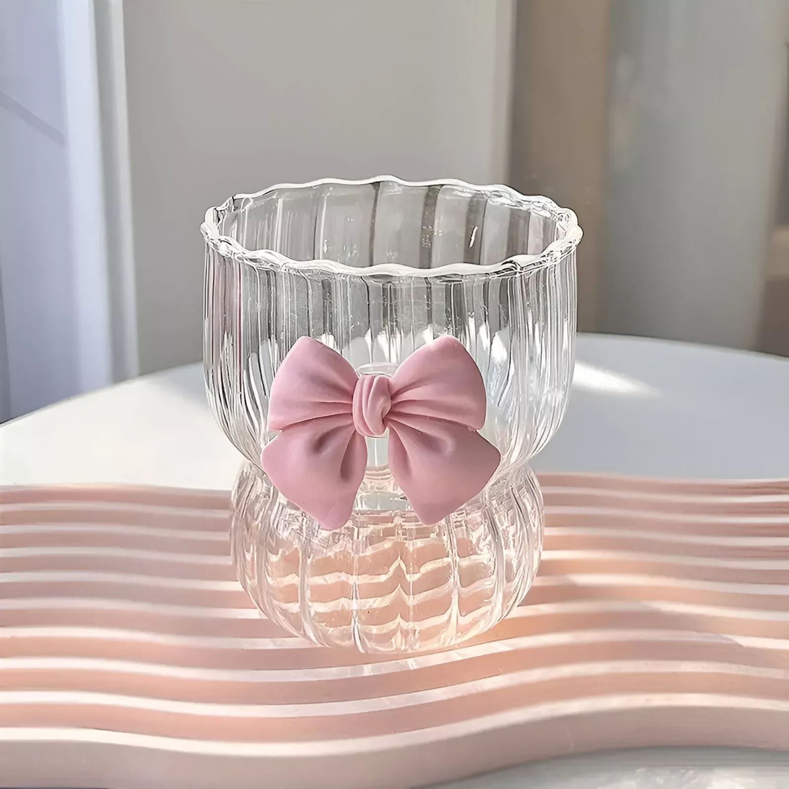 Elevate your daily ritual with this Clear Glass Mug adorned with a charming bow decoration and a delicate striped design. Perfect for enjoying your morning coffee, afternoon tea, or a cozy bowl of oatmeal, this glass mug brings a touch of elegance to your kitchen. The transparent glass allows you to appreciate the beauty of your beverages, whether you’re sipping a rich espresso or a refreshing iced tea. Its graceful and minimalistic style complements any setting, making it a perfect addition to your breakfast table or tea collection.