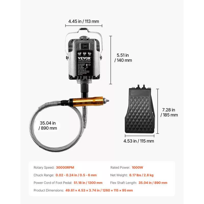 Take your craftsmanship to the next level with this 1000W electric flex shaft grinder. Whether you’re carving, polishing, drilling, or grinding, this high-performance rotary tool delivers up to 30,000 RPM for effortless precision. Its extended 35-inch flexible shaft allows for smooth maneuverability, while the foot pedal control ensures hands-free operation for greater accuracy and ease. Designed for both professionals and DIY enthusiasts, this tool is a must-have for anyone working with wood, metal, jewelry, and more.