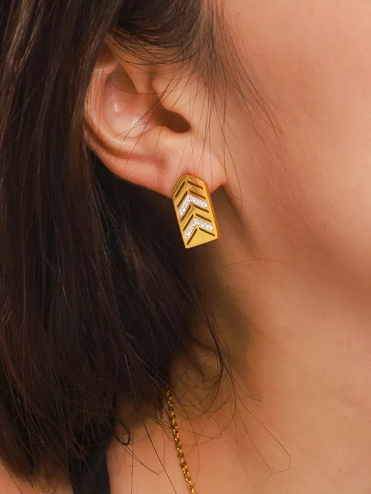 Featuring a unique herringbone pattern, these statement studs boast a geometric design that radiates confidence and individuality. Their sleek yet bold appearance makes them a standout piece, while their high-quality stainless steel construction ensures they remain durable and long-lasting, maintaining their shine even with regular wear.