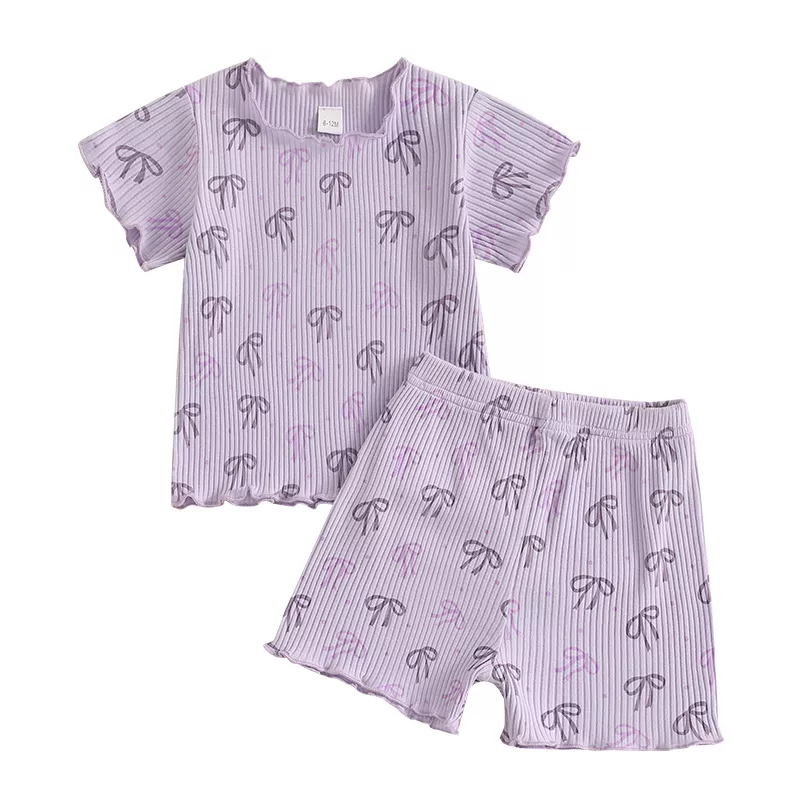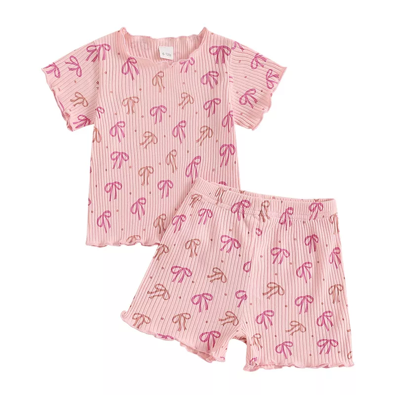 Looking for the perfect outfit to keep your little one cute and comfy all summer long? This charming 2-piece shorts set for girls is made to impress. Featuring a ribbed short sleeve T-shirt with a sweet bow print and lettuce trim, paired with matching elastic-waist shorts, this outfit is a go-to for warm weather fun. Whether she’s playing in the park, attending a birthday party, or just hanging out at home, your little girl will love how soft, breathable, and stylish this outfit feels.