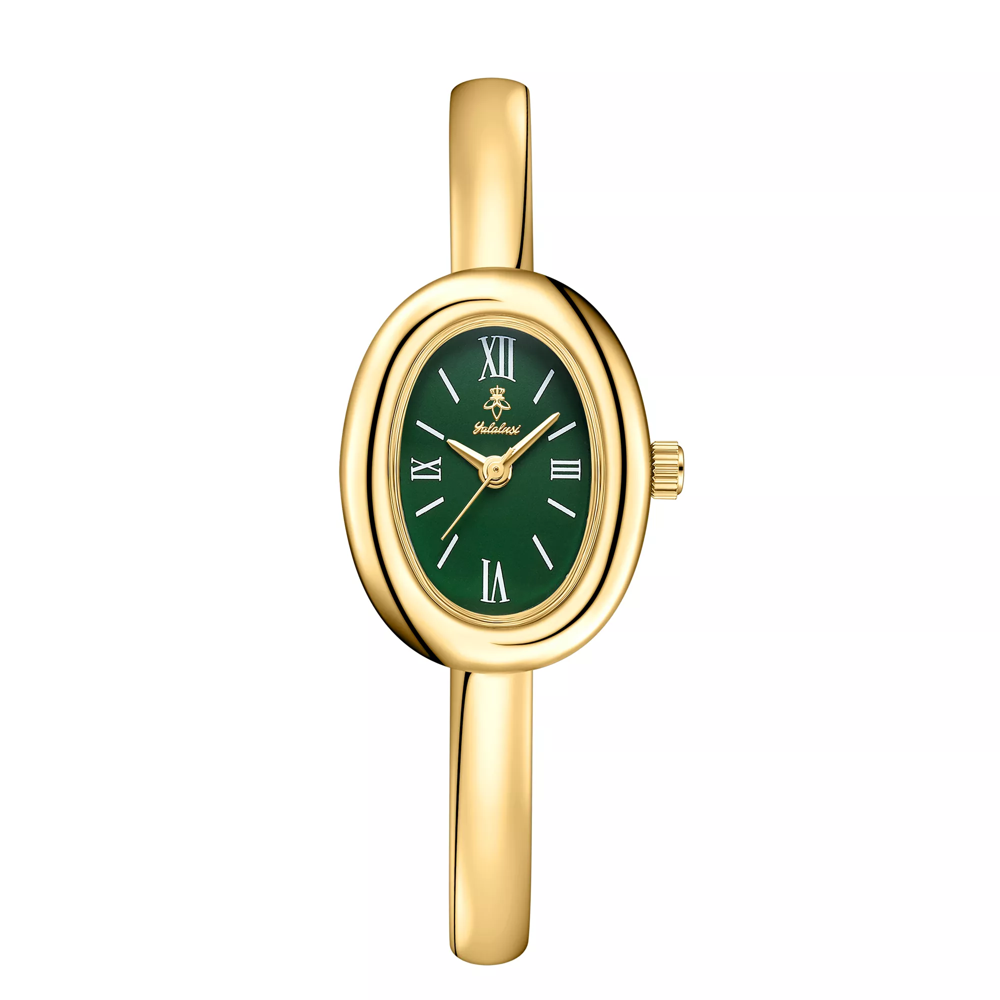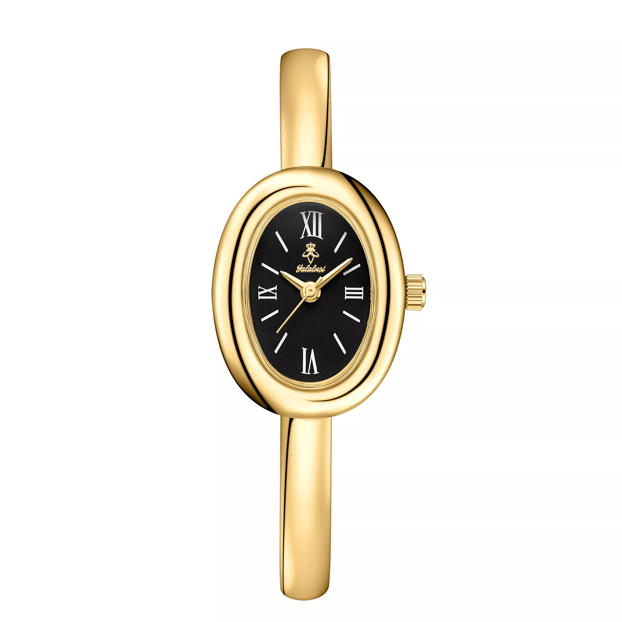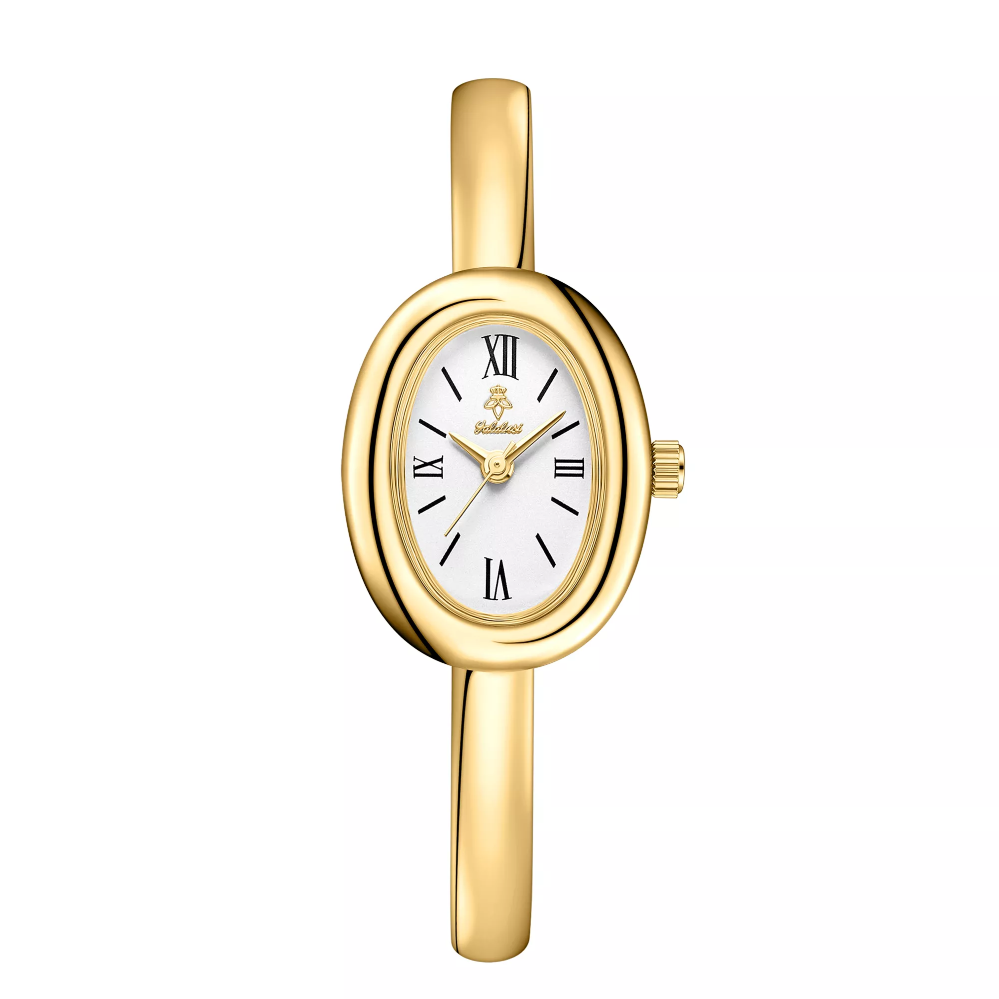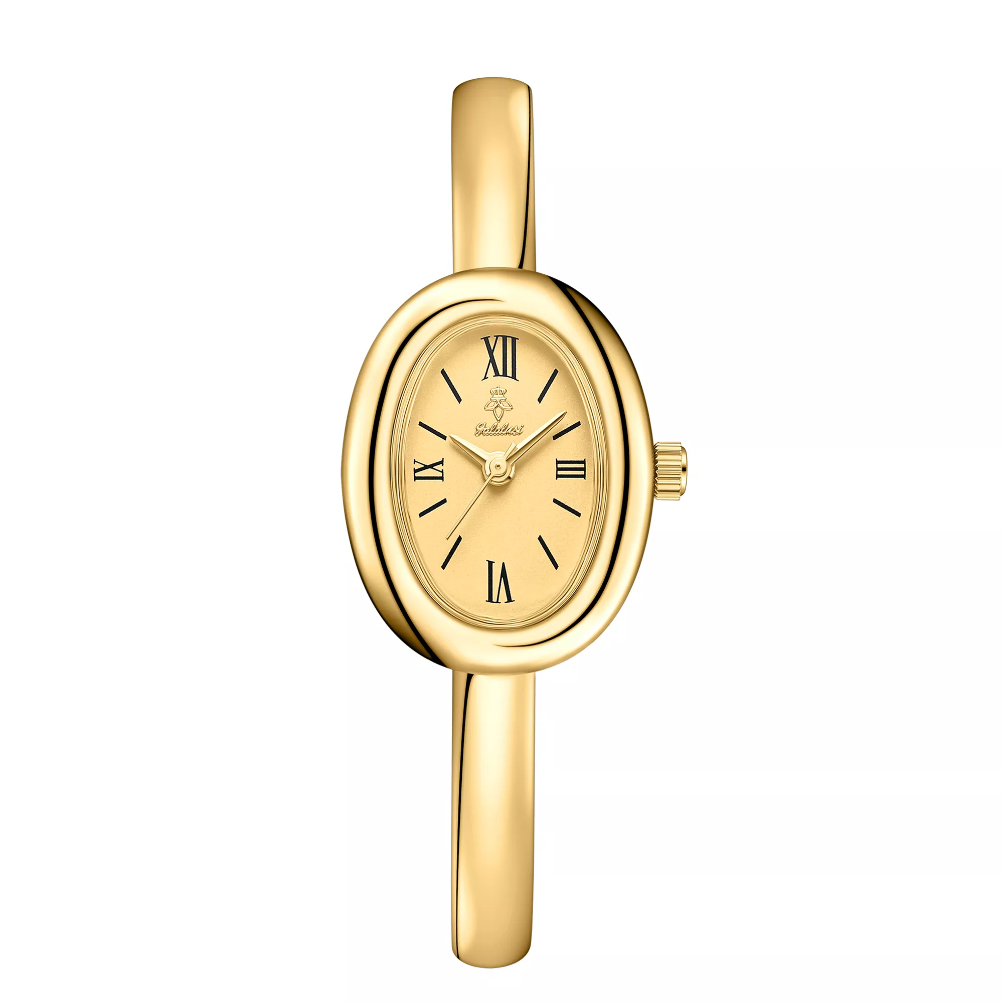 The timepiece is powered by a precise Japanese quartz movement, known for its reliability and long-lasting performance. The watch surface is crafted from polished glass, and the entire case benefits from an advanced IP plating technique, giving it a lustrous gold finish that resists fading and wear for up to 2 years.