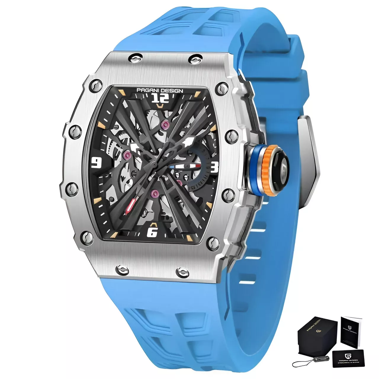 Built for modern gentlemen, this timepiece boasts a robust stainless steel case and a sleek rubber strap that ensures all-day comfort. The scratch-resistant sapphire glass provides crystal-clear visibility, while the 5ATM water resistance allows you to wear it confidently through rain, splashes, and even swimming.