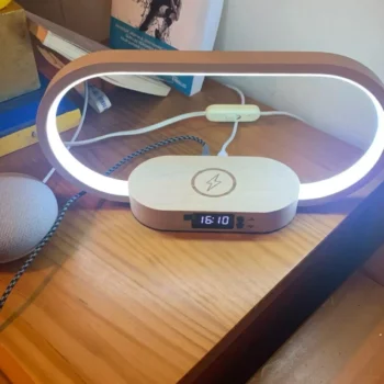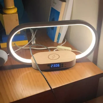 Modern and practical design. You can charge your mobile phone in it. You have time too. And as a lamp, 3 shades of light and different intensities in each one. Easy to turn on and off, with a simple touch on the structure. It is very light due to its design. Very happy with the purchase.