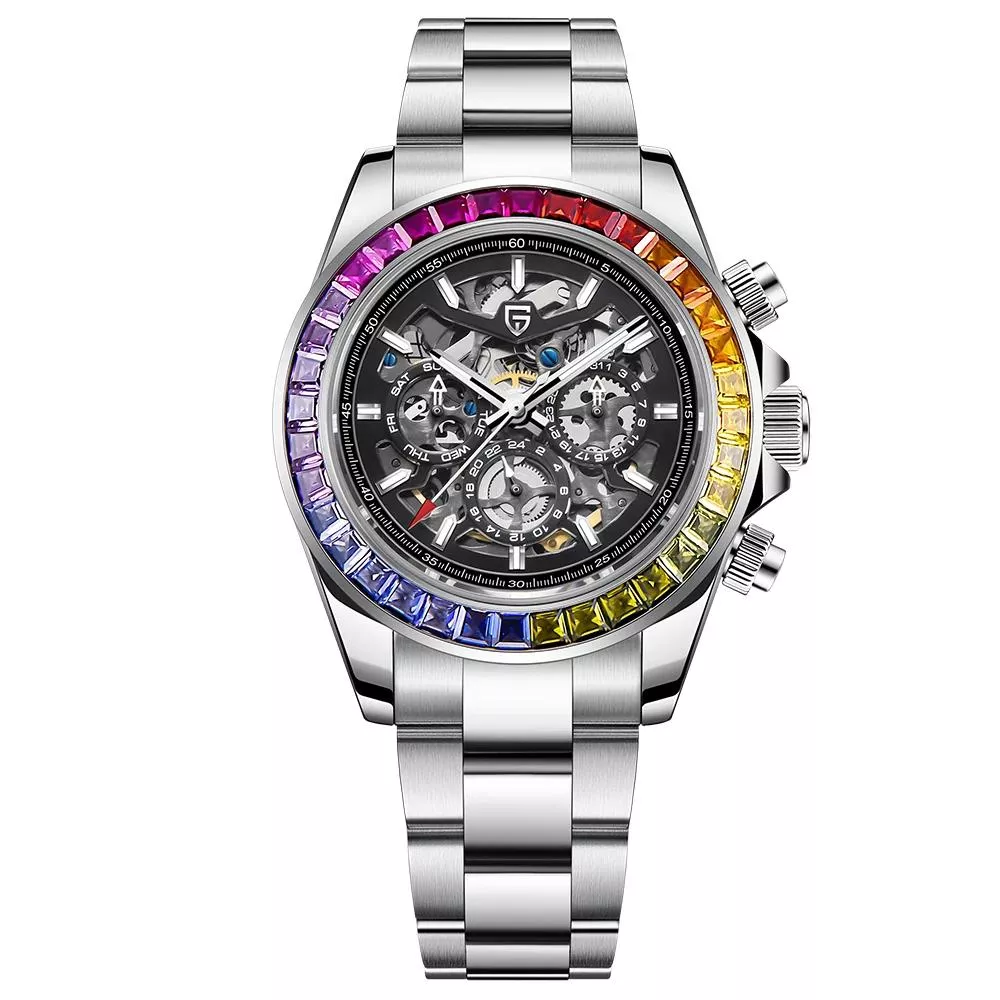 Not just a timepiece but a statement of style, this mechanical wristwatch is perfect for men who appreciate fine craftsmanship and attention to detail. The automatic self-wind movement ensures that you’ll never need to worry about winding your watch, and the shock-resistant properties guarantee longevity and durability. Whether you’re swimming, attending a business meeting, or enjoying a casual day out, this watch can handle it all with ease. The standout rainbow bezel and elegant design make it the perfect accessory for every occasion, blending seamlessly with your wardrobe.