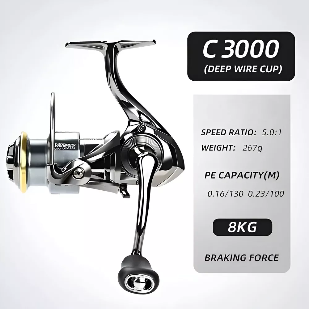 This spinning reel isn’t just another piece of fishing gear; it’s a reliable companion for a wide range of fishing environments, including oceans, rivers, lakes, and reservoirs. Its metal fine-carving line cup ensures a large line capacity, while the bold throwing ring minimizes resistance for farther casting. Plus, the highly smooth line wheel provides stability and precision that anglers can count on.