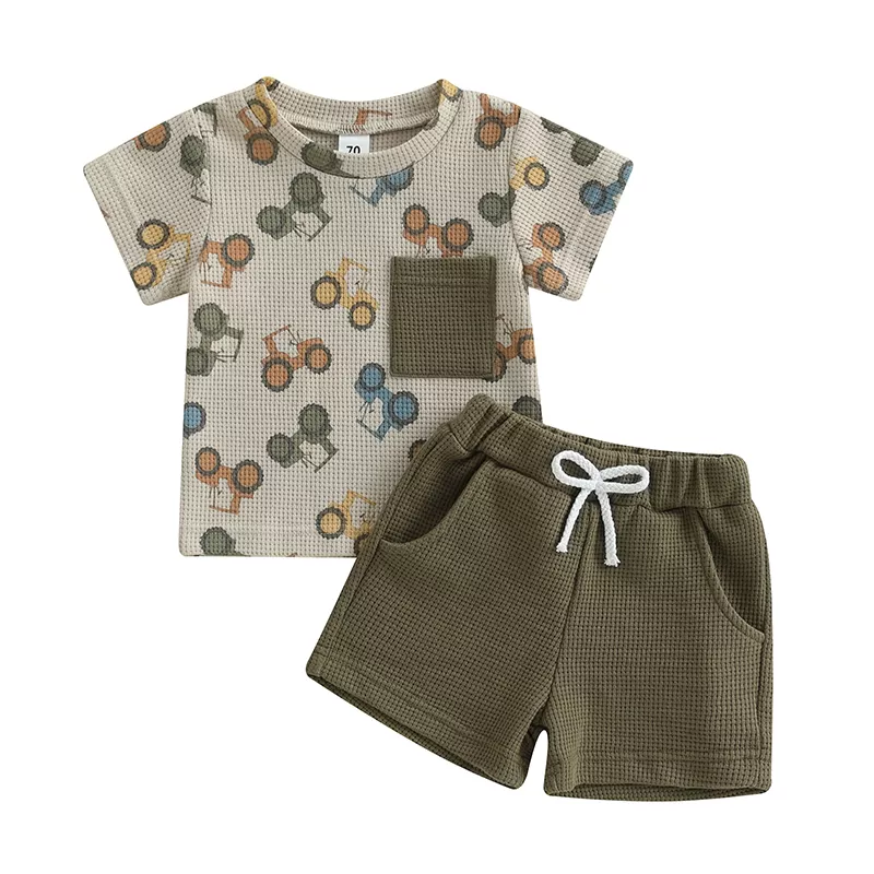Let your toddler play, crawl, and explore in cool, comfy style with this adorable 2-piece summer outfit. Designed with both fun and function in mind, this baby boy set includes a breathable waffle knit short-sleeve t-shirt featuring a playful tractor print, paired with solid-color shorts with a soft elastic waistband. It’s the ultimate warm-weather outfit that keeps your little one looking cute and feeling comfy from playtime to nap time.