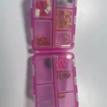 This pill container is not only adorable but also perfectly sized for both your purse and travel needs. Its dual-sided design is particularly useful for keeping medications separate, making it ideal for both yourself and your fiancee. It's a durable option available in various colors and is highly recommended for anyone who takes medication.