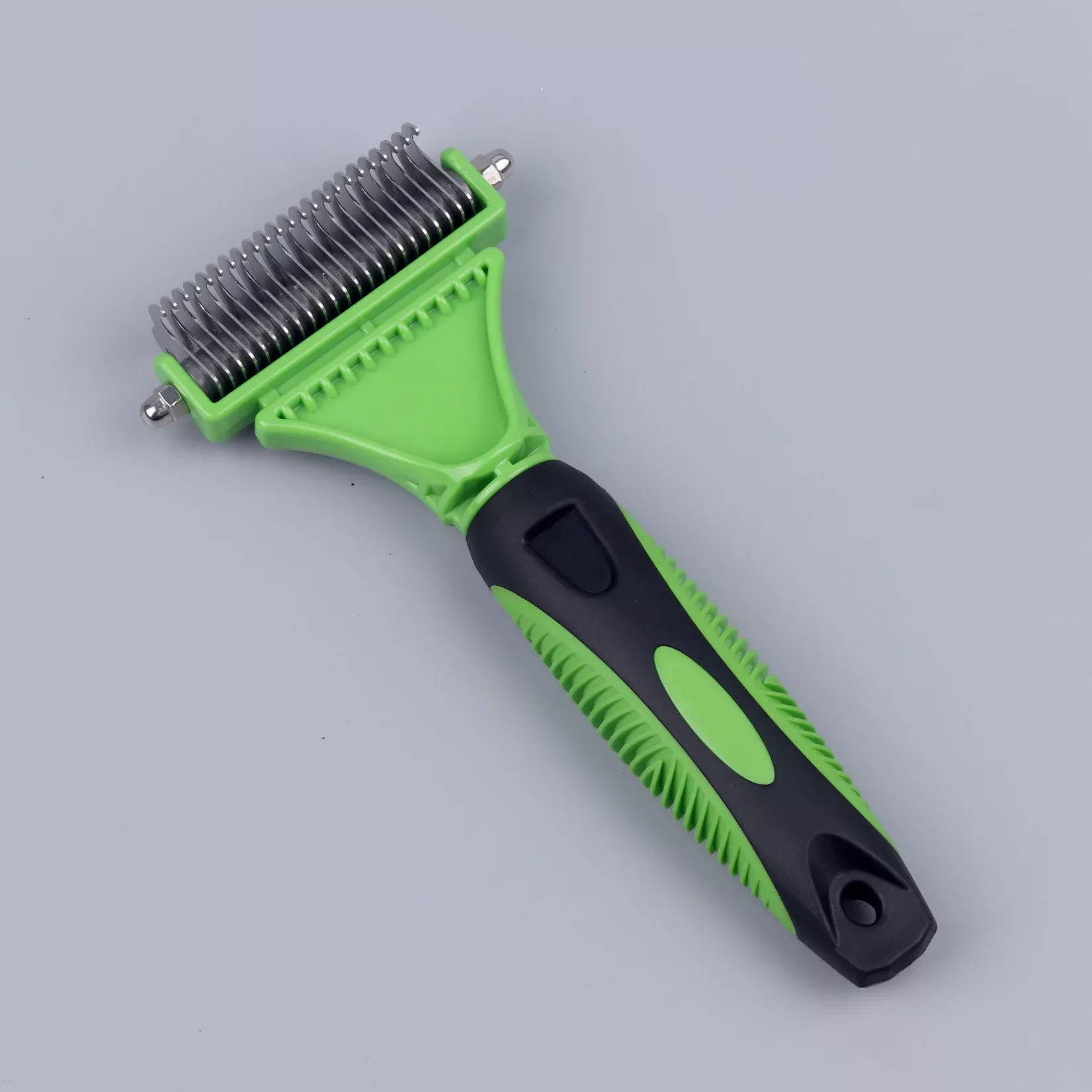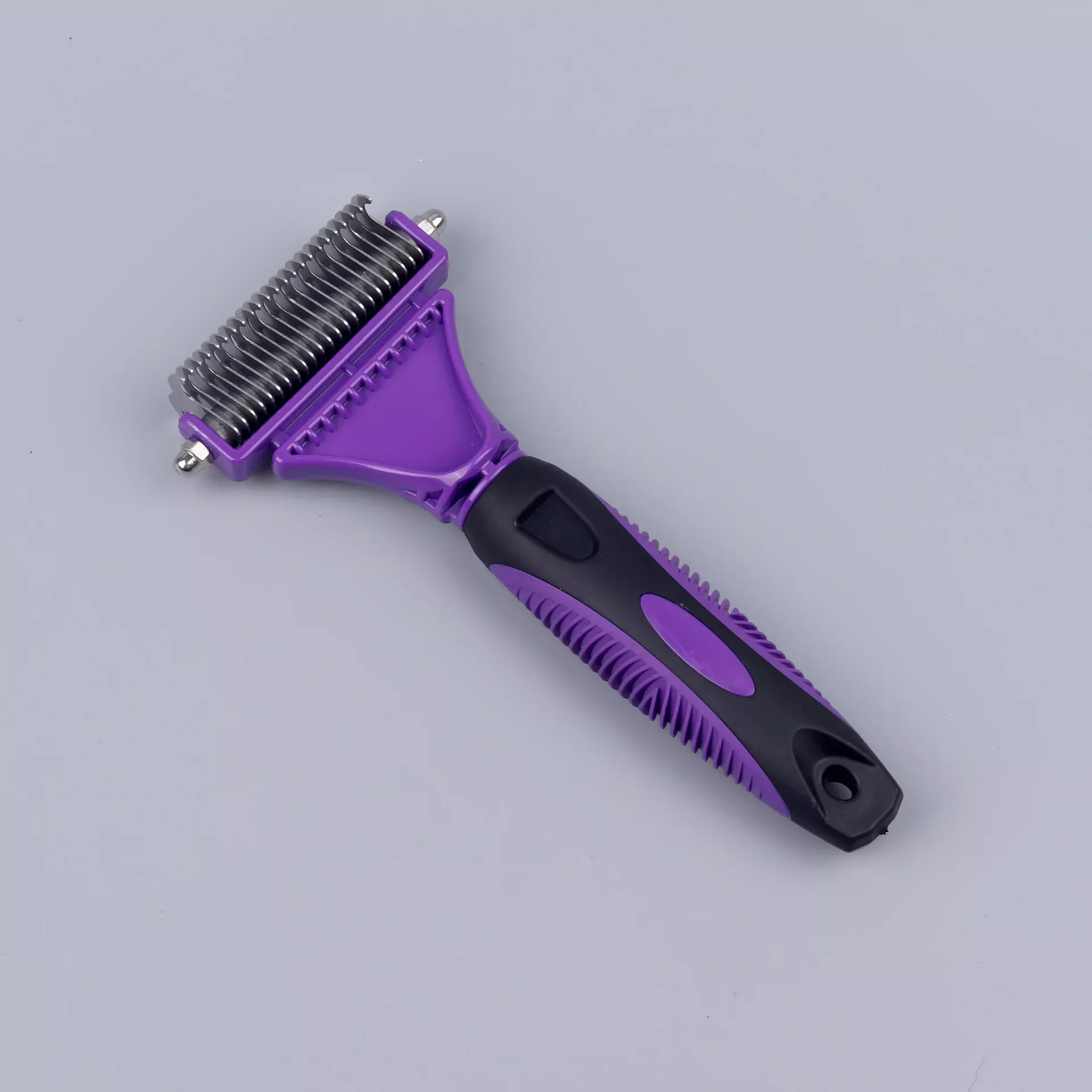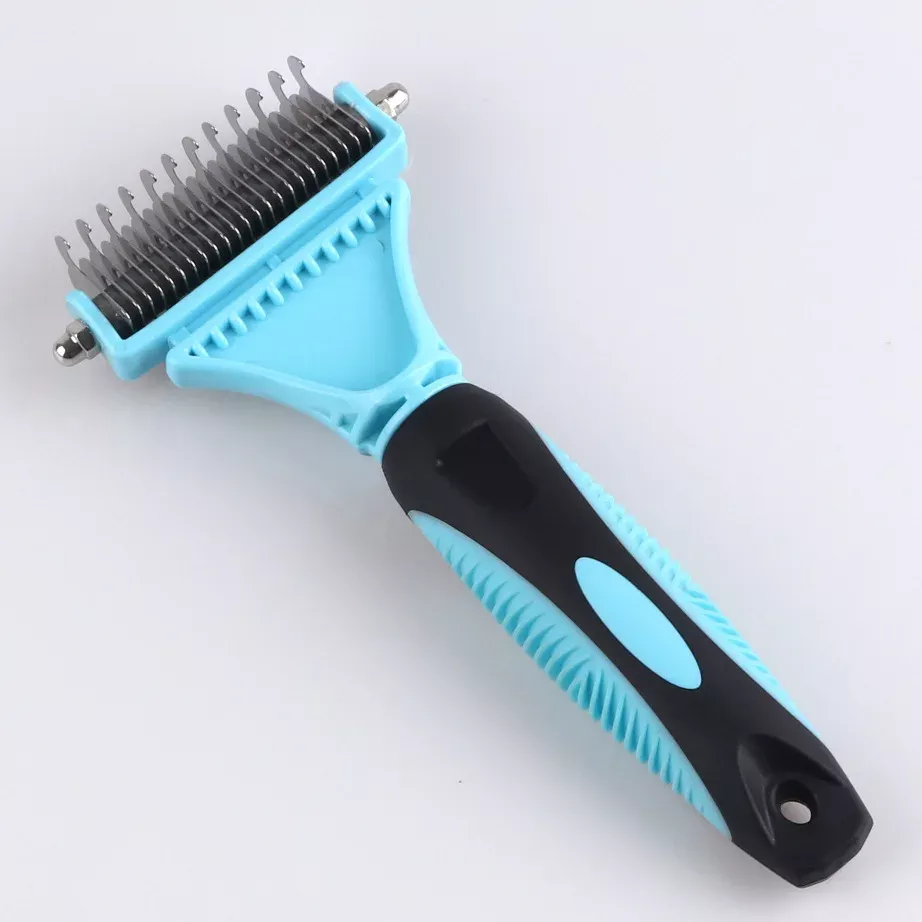 Crafted from durable stainless steel and TPR (thermoplastic rubber), this brush offers a sturdy, non-slip grip and a dual-sided comb head that works for various grooming needs. Use the dematting side to tackle tough knots and the shedding side to reduce undercoat buildup. This tool is best used during your pet’s regular grooming sessions or seasonal shedding periods and works wonders on both short and long-haired breeds.