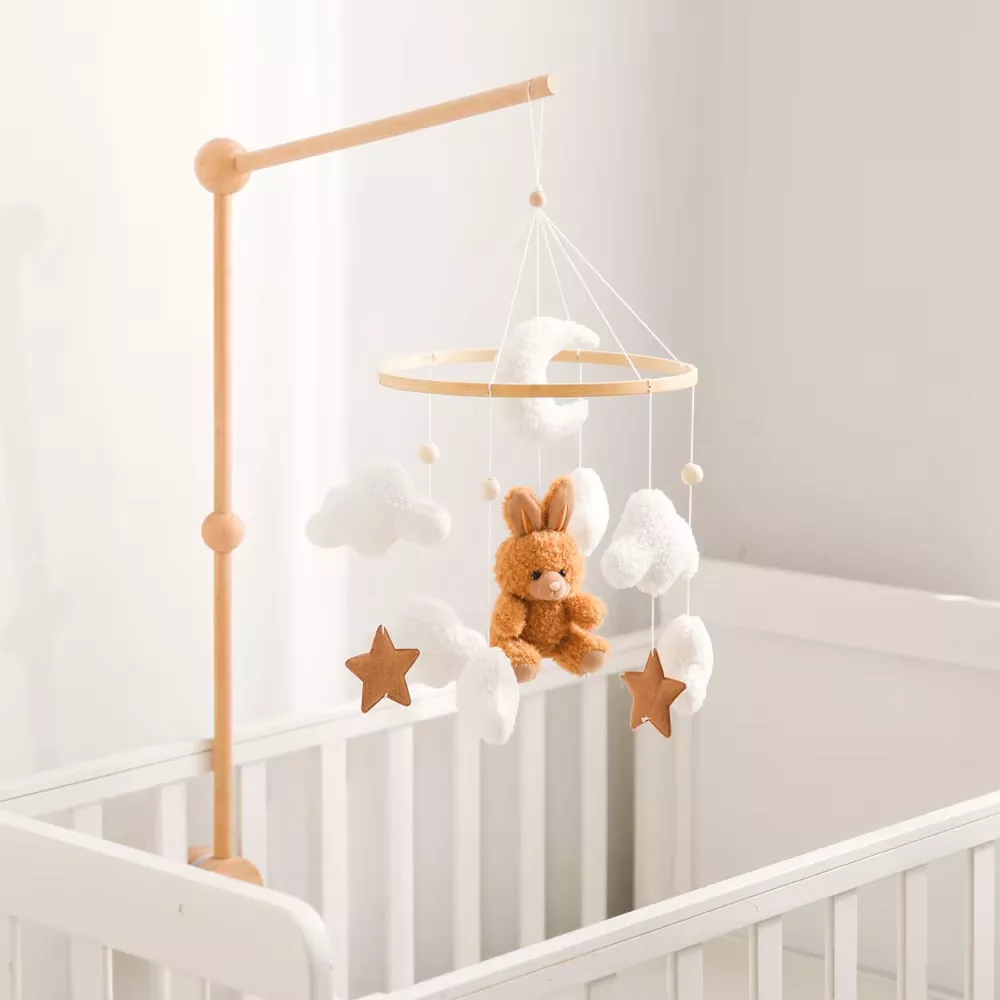 Wooden Crib Mobile with Velvet Bunny and Music Box for Newborns